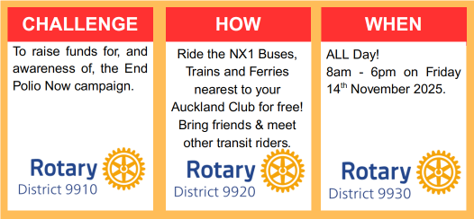 Rotary Club volunteers will ride around Auckland public transport wearing red shirts from 8am to 6pm as part of the Polio All Transit campaign. Article here: https://pmn.co.nz/articles/sea-of-red-set-to-flood-auckland-trains-and-ferries-in-anti-polio-campaign